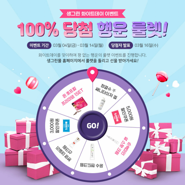 △자연성 한방화장품 생그린에서 화이트데이를 기념해 '100%당첨 행운 룰렛 이벤트'를 진행한다. 생그린 공식 온라인 쇼핑몰에서 100% 당첨 행운 룰렛 이벤트를 통해 생그린의 인기 제품, 할인 쿠폰 등 풍성한 경품과 만나는 행운의 기회를 제공한다. 이벤트 기간에 생그린 공식 온라인 쇼핑몰에 방문해 주사위 모양의 이벤트 이미지를 통해 나오는 행운 룰렛 이벤트에 참여할 수 있다.