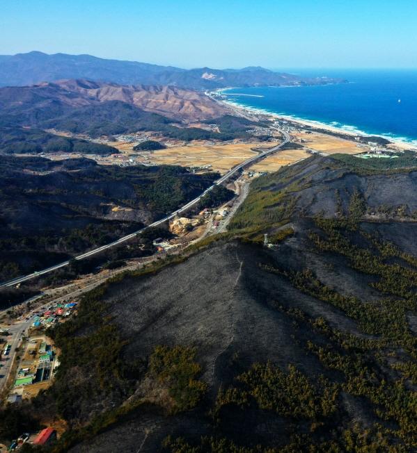 경북 울진에서 시작해 강원도 삼척까지 확산한 산불로 6일 강원도 동해시 일원의 산림이 검게 타 숯덩이로 변했다. 피해 규모는 여의도 면적 49배, 축구장 약 2만 개 규모로, 불길의 반경이 넓어짐에 따라 더욱 커질 것으로 예상된다. ▶관련 기사 2면 연합뉴스