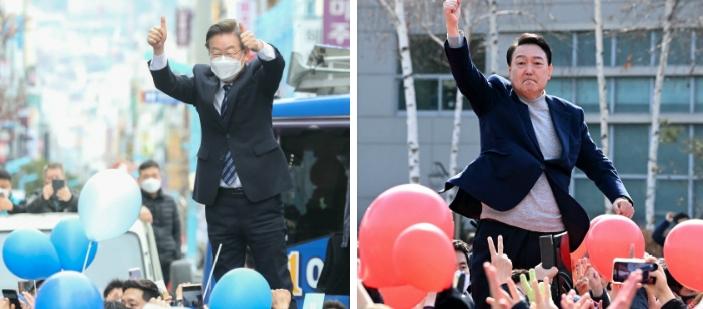 제20대 대통령선거가 코앞으로 다가오면서 더불어민주당 이재명 후보와 국민의힘 윤석열 후보 양측의 막판 지지층 결집을 위한 세몰이가 뜨겁다. 이 후보가 7일 오후 부산 중구 광복로에서 열린 부산 집중 유세에서, 윤 후보는 이날 오전 경기도 구리시 구리역광장에서 열린 유세에서 지지를 호소하고 있다. 정대현 기자 jhyun@ 국회사진기자단3·9 대선을 이틀 앞둔 7일 여야가 엇갈리는 판세 전망으로 격돌했다. 막판 지지층 결집을 위한 수싸움이다. 그 직전까지 ‘박빙 열세’라고 보던 더불어민주당은 2~3%포인트(P) 차 역전을 전망한 반면 국민의힘은 최소 5%P 이상, 많게는 두 자릿수 격차를 언급하기 시작했다. 서로 ‘승리는 우리 것’이라고 주장했지만, 현격한 ‘숫자’의 차이에서 현재까지 판세를 바라보는 양측의 내부 기류가 간접적으로 읽힌다.