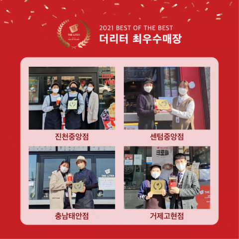 더리터 2021년도 최우수매장으로 선정된 곳은 ▲진천중앙점 ▲충남태안점 ▲센텀중앙점 ▲거제고현점 등 총 4곳으로, 상·하반기 우수매장 중 일부가 선정되었다. 하반기 우수매장은 총 9곳으로, ▲정읍상동점 ▲대구율하점 ▲동서대경남정보대점 ▲군산디오션점 ▲회룡역점 ▲신사점 ▲장한평역점 ▲진천중앙점 ▲경북고령점이다.