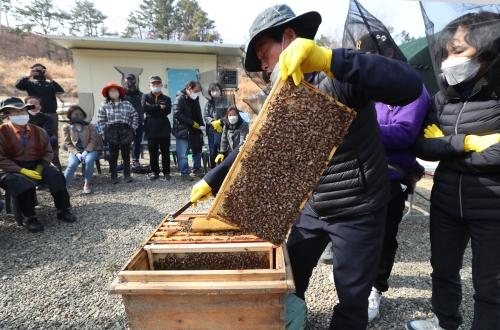 15일 부산 기장군 일광면에서 농업기술센터 농업 곤충 양봉 과정 교육생들이 봄철 양봉 관리에 대한 현장 실습을 하고 있다. 이번 교육은 농가의 신 소득원 창출과 전문농업인 양성을 위해 마련됐다. 정대현 기자 jhyun@