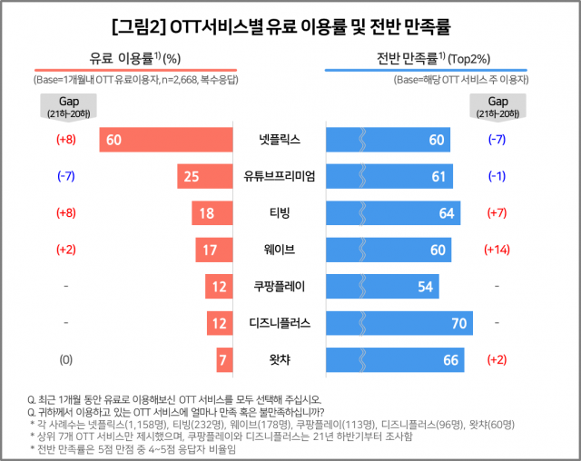 유료 이용률 1위는 넷플릭스로 OTT 이용자의 60%가 넷플릭스를 이용하는 것으로 나타났다. 2위는 유튜브프리미엄(25%), 3위는 티빙(18%), 4위는 웨이브(17%)를 기록했다. 쿠팡플레이와 디즈니플러스는 각각 12% 점유율로 공동 5위였고 왓챠가 7%로 그 뒤를 이었다.
