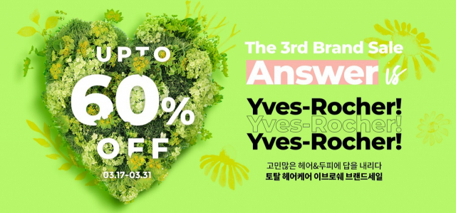 △60년 전통 프랑스 No.1 보태니컬 내추럴 브랜드 '이브로쉐'가 온라인 공식몰을 통해 봄 맞이 브랜드 세일 'Answer is Yves-Rocher'를 진행한다. 이날부터 3월 31일까지 진행되며 소비자에게 헤어&두피의 고민에 맞는 제품을 추천하고, 다양한 할인과 이벤트 혜택을 제공한다. 오메가 성분이 풍부하고 인체 피지 성분과 유사해서 피부나 모발에 잘 흡수되는 호호바씨 오일 성분이 함유된 '호호바 리페어 포티파잉 헤어세럼'과 '호호바 유니버셜 밤'이 포함된 기획세트를 선보인다. '호호바 리페어 포티파잉 헤어세럼'은 고데기, 드라이기열에서 230도까지 모발 손상을 방지해주고, 손상된 머릿결을 부드럽게 가꿔주는 산뜻한 로션 타입의 제품이다. 베스트셀러인 '라즈베리 샤인 헤어식초'와 '모링가 리프레시 헤어식초' 포함 전 제품을 특별 할인 판매하는 등 최대 60% 할인·특가 이벤트도 진행한다. 샴푸, 컨디셔너, 바디워시, 바디로션 등 다양한 제품도 초특가 가격에 만나볼 수 있다. 공식 웹사이트를 통해 단독으로 진행하는 세일 기간 동안 무료배송·다양한 할인 쿠폰 혜택을 제공하고 구매고객 전원 샘플 증정·금액대별 사은품을 증정할 예정이다.