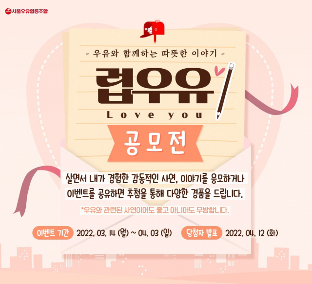 △서울우유협동조합은 공식 SNS 채널을 통해 '럽우유 사연 공모전' 이벤트를 진행한다. 코로나19로 힘들고 지친 마음을 위로하고자 기획됐으며 누군가에게 도움을 주고 받았던 소중하고 따뜻한 사연 혹은 나만의 감동적인 이야기로 누구나 자유롭게 응모가 가능하다. 4월 3일까지 진행되는 이벤트로 당첨된 대상 1명에게는 LG 오브제컬렉션과 서울우유 치즈선물세트 고급형, 최우수상 1명에게는 LG 코드제로 A9S와 서울우유 치즈선물세트 실속형을 선물로 증정한다. 대상과 최우수상에 선정된 사연은 웹툰으로 제작되며 공식 SNS 채널에 업로드될 예정이다. 우수상 2명에게는 다이슨 에어랩과 서울우유 프리미엄 선물세트, 장려상 30명에게는 서울우유 레트로 선물세트를 증정한다. '소문내기 이벤트'를 통해 응모한 사연을 다양한 SNS 채널에 공유하는 분들 중 500명 추첨을 통해 스타벅스 커피 기프티콘도 제공한다. 당첨자 발표는 4월 12일이다.