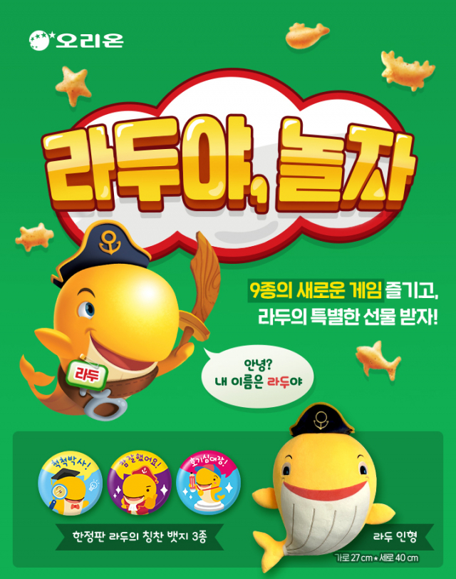 △오리온은 '고래밥'의 '펀(fun)' 콘셉트를 강화하기 위해 제품 패키지 안에 있는 미니게임을 리뉴얼하고, '라두야 놀자' 소비자 이벤트를 진행한다. 과자를 먹으면서 함께 즐길 수 있도록 고래밥 패키지 내부에 인쇄한 미니게임을 '요리조리 미로탈출', '똑똑 점잇기', '알쏭달쏭 다른그림찾기' 등 3가지 버전으로 다양화하고 개수도 총 9개로 늘렸다. 게임의 난이도도 1~4단계로 나누고 제품에 랜덤하게 담아 미니게임을 즐기는 재미를 배가했다. 4월 30일까지 이벤트도 진행한다. 고래밥 패키지 속 미니게임 참여 사진이나 게임 난이도를 나타내는 '별'을 10개 이상 모아 개인 SNS에 인증하고, 패키지 뒷면에 있는 QR 코드로 이벤트 페이지에 접속해 등록하면 자동 응모된다. 추첨을 통해 총 650명에게 '고래밥 초코범벅' 1박스 또는 고래밥 캐릭터인 라두 인형과 칭찬뱃지 3종 세트를 선물로 증정한다.