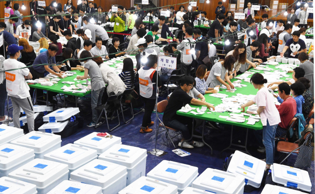 6·1 지방선거가 18일로 75일 앞으로 다가왔지만 선거구, 후보, 공천 방식 등이 베일에 가려 '깜깜이 선거'를 재연하고 있다. 제7회 전국동시지방선거가 치러진 2018년 6월 13일 부산 남구 부경대학교 체육관에 마련된 개표소에서 개표사무원들이 개표작업을 하고 있다. 강선배 기자 ksun@