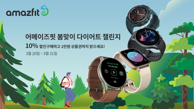 △글로벌 스마트 웨어러블 브랜드 어메이즈핏이 오는 20일부터 31일까지 고객들의 다이어트 성공을 응원하는 '어메이즈핏 다이어트 챌린지'를 진행한다. 행사 기간동안 공식 온라인 입점 판매처에서 행사 대상 어메이즈핏 스마트워치를 구매한 고객이 대상이다. 이벤트에 참여하려면 일주일간 어메이즈핏 스마트워치를 착용하고 운동한 뒤 개인 SNS에 운동내역을 업로드 후 4월 13일까지 접수하면 된다. 참여자 전원에게 도전 성공 선물로 문화상품권 1만 원권이 제공되며, 추첨을 통해 1명에게 심박수를 측정할 수 있는 스포츠 이어폰 어메이즈핏 파워버즈 프로 1정이 증정된다. 할인 행사 대상 제품은 GT3 시리즈와 GT2 시리즈, GT2e시리즈 그리고 티렉스 프로며 행사 기간동안 10% 할인된 가격에 만나볼 수 있다. 젠버즈, 파워버즈 프로, 빕유, 밴드5 등의 특별 할인 상품을 공식 네이버 스마트스토어에서 최대 36% 할인가에 제공할 예정이다.