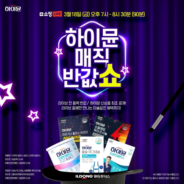 △일동후디스가 18일 오후 7시부터 네이버 쇼핑라이브에서 '하이뮨 매직 반값쇼'를 진행한다. 하이뮨 단백질 보충제부터 건강기능식품까지 폭넓게 구성된 라이브 전 품목을 반값에 판매하는 파격적인 할인 혜택을 제공한다. 또 신제품 '하이뮨 칼슘 마그네슘'과 '하이뮨 쏘팔메토 옥타코사놀'을 최초 공개하는 깜짝 이벤트도 진행될 예정이다. 풍성한 혜택도 마련했다. 구매자 전원에게 구매 수량 당 '하이뮨 루테인 지아잔틴 아스타잔틴' 1개월 분을 증정하며, '하이뮨 프로틴 밸런스 &(앤)바디' 스틱 20포는 추첨을 통해 50명에게 전달할 예정이다. '하이뮨 프로틴 밸런스' 스틱 100포 구매자 중 선착순 400명에게는 하이뮨 섭취에 용이한 '블랜더 보틀 클래식'을 제공한다. 라이브 실 결제 금액 10만 원 이상 구매자에게는 신세계 모바일 상품권 1만 원권을 증정하며, 일동후디스 공식 스마트 스토어를 통해 2만 원 이상 구매 시 최대 2만 원 할인이 가능한 중복 할인 쿠폰도 받을 수 있다.