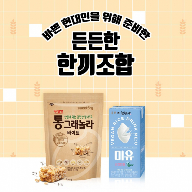 △웅진식품은 자사 SNS에서 '곡물 한 끼 조합' 댓글 이벤트를 진행한다. 바쁜 현대인들이 든든하게 배를 채울 수 있도록 자사의 제품으로 구성된 '곡물 한 끼 조합'을 선보인다. 통곡물 5종의 고소함을 담은 대영식품의 '스위토리 통그래놀라 바이트'와 국내산 쌀과 현미 등 식물성 원료를 담은 '아침햇살 미유'의 조합으로 맛뿐 아니라 곡물의 영양까지 든든하게 한 끼를 채울 수 있다. 이벤트는 오는 21일까지 웅진식품 인스타그램에서 진행된다. 이벤트 게시물에 기대평을 댓글로 남기면 참여 가능하다. 추첨을 통해 10명에게 스위토리 통그래놀라 바이트와 아침햇살 미유를 증정한다.