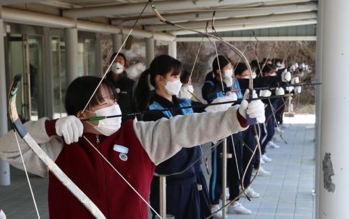 22일 부산시 학생교육원에서 열린 중학생 리더십 과정에 참가한 학생들이 국궁 체험을 하고 있다. 학생교육원은 학생들의 의사소통 능력 및 리더십 함양을 위해 매년 리더십 과정을 운영하고 있다. 정대현 기자 jhyun@