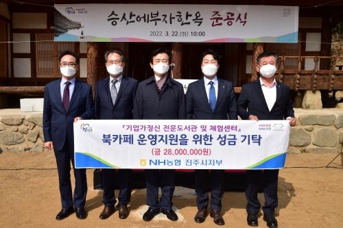 NH농협 진주시지부(지부장 김정구)는 22일 지수면 승산마을 ‘기업가정신 전문도서관 및 체험센터’ 북카페 운영 성금 2800만 원을 진주시복지재단에 기탁했다.