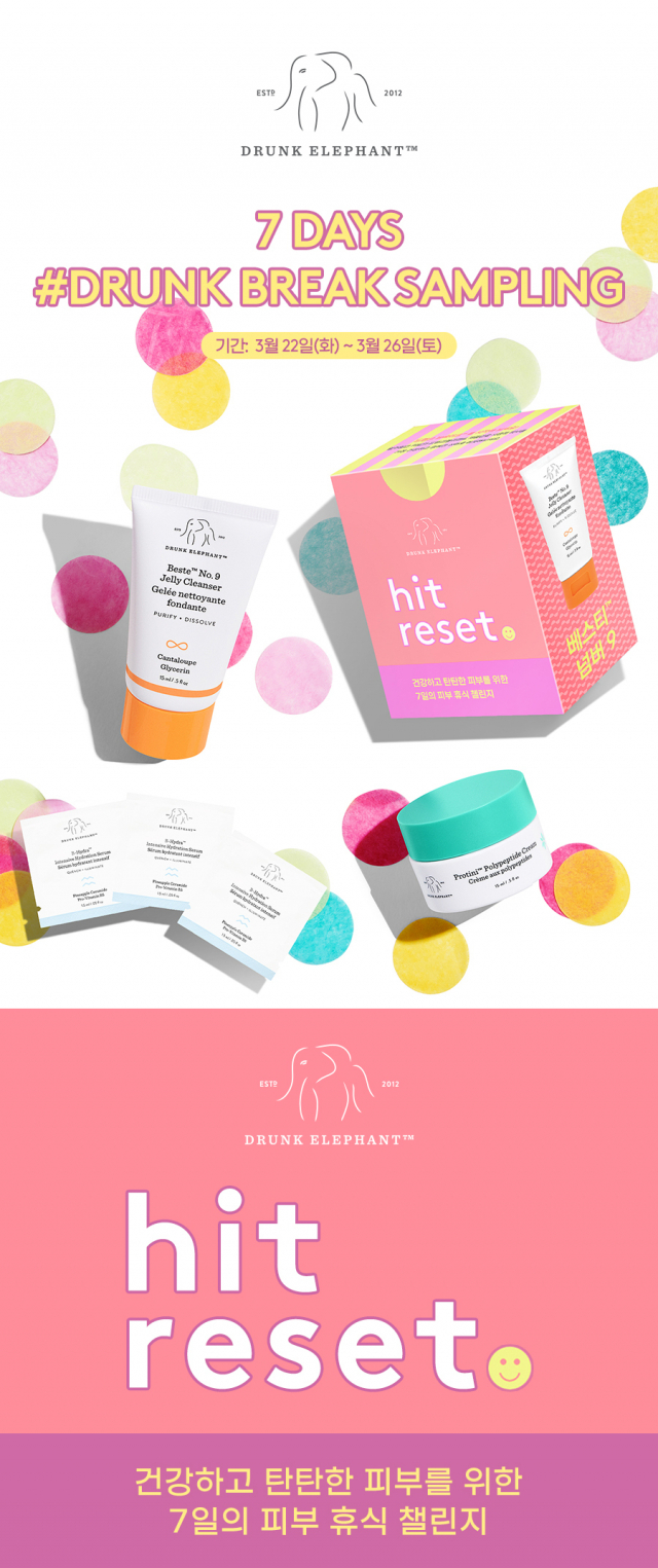 △글로벌 스킨케어 드렁크엘리펀트가 7일 동안 스킨케어 효능을 체험해볼 수 있는 드렁크브레이크 키트 샘플링 이벤트를 진행한다. 오는 26일까지 진행되는 이번 샘플링은 세포라 네이버 스마트 스토어에서 매일 오전 10시에 오픈, 선착순 200명에게 참여의 기회가 부여된다. 스토어 소식 알림 동의를 하면 100원 쿠폰이 발행돼 배송비 2500원만 결제하면 키트를 받을 수 있다. 키트는 건강하고 탄탄한 피부를 위한 7일의 피부 휴식 첫단계를 경험해볼 수 있는 디럭스 사이즈의 스킨케어 키트다. 메이크업과 과도한 유분, 얼굴에 남아있는 잔여물을 말끔하게 클렌징하는 순한 젤리 제형의 '베스티™ 넘버 나인 젤리 클렌저' 15mL와 시그널 펩타이드가 함유돼 촉촉하고 탄력있는 피부로 가꿔주는 '프로티니™ 폴리 펩타이드 크림' 5mL, 메마른 피부를 촉촉하게 해주는 수분세럼 'B-하이드라™ 인텐시브 하이드레이션 세럼' 사셰 3개로 구성됐다. 모든 제품에 피부에 자극을 유발할 수 있는 6가지 성분인 서스피셔스6™를 사용하지 않는 것을 핵심 철학으로 삼아 드렁크엘리펀트의 제품만을 사용해 피부에 휴식을 주는 사용 방법인 '드렁크브레이크'를 권장하고 있다. 추가 혜택도 마련됐다. 결제한 드렁크브레이크 키트를 3월 31일까지 구매 확정하면 드렁크엘리펀트 정품 제품 7만 원 이상 구매시 15% 할인받을 수 있는 쿠폰이 발행된다. 쿠폰은 5월 31일까지 세포라 네이버 스마트 스토어에서 사용 가능하다.
