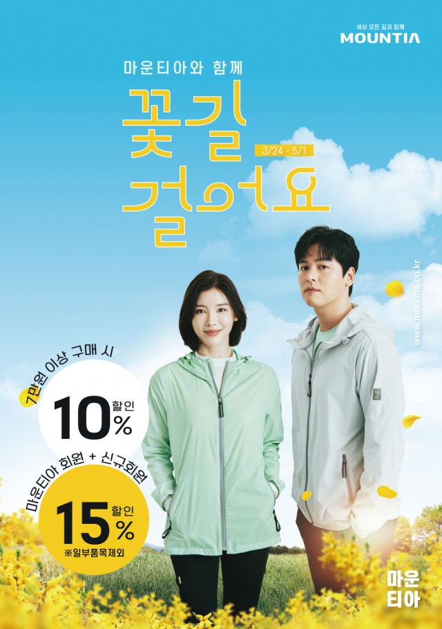△아웃도어 컬처 브랜드 마운티아가 봄 나들이를 준비하는 고객들을 위해 5월 1일까지 '마운티아와 함께 꽃길 걸어요' 프로모션을 진행한다. 마운티아의 다양한 제품들을 합리적인 가격으로 구매할 수 있는 기회로 '서지B자켓'과 '페어M자켓' 등 일교차가 큰 날씨에 입기 좋은 신상 방풍 자켓을 비롯해 티셔츠, 조끼, 워킹화, 등산화, 모자, 가방 등 봄에 입기 좋은 의류와 신발·용품들을 다양하게 만나 볼 수 있다. 프로모션 기간 동안 해당 제품들을 7만 원 이상 구매하는 고객들에게는 10% 할인을, 마운티아 멤버십 회원·신규 가입 회원에게는 15% 할인 혜택을 제공한다. 구매는 마운티아 전국 오프라인 매장에서 가능하다.