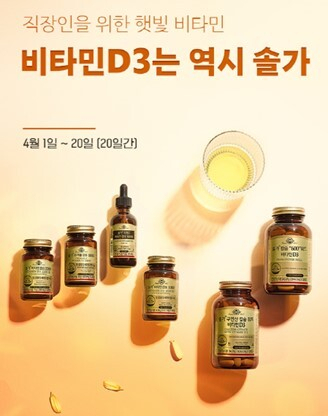 △프리미엄 비타민 기업 한국솔가가 솔가 공식 몰에서 20일까지 솔가 비타민D 제품 8종을 취향에 따라 제형별로 선택할 수 있는 비타민D 프로모션을 진행한다. 물과 함께 간편하게 섭취할 수 있는 캡슐· 정제 타입의 ▲'비타민 D3 2200IU' ▲'비타민 D3 1000IU' 90정과 180정 2종 ▲'비타민 D3 600IU', 뼈 건강을 위한 칼슘을 동시에 섭취할 수 있는 ▲'칼슘 600 위드 비타민D3' ▲'구연산 칼슘 위드 비타민D3', 샐러드나 음료 등에 뿌려 맛있게 섭취할 수 있는 ▲'리퀴드 비타민D3 5000', 물 없이 맛있게 씹어먹을 수 있는 츄어블 타입의 ▲'츄어블 비타민D3 1000IU'이다. 4일부터 10일까지 멤버십 전용 전 제품 할인 쿠폰을 발급하는 '솔가데이'도 진행한다. 이 기간 '솔가몰' 회원이라면 추가 할인 혜택을 받을 수 있다. 기간 내 비타민D 기획전 제품 구매 시 선착순으로 '닥터유 면역수'를 400명에게 증정, 5만 원 이상 구매 시 '소버스 종합 비타민'을 2500명에게 증정한다. 베스트 포토 후기를 작성한 고객에게는 구매 제품의 1세트 추가 증정, 솔가 앱을 다운로드받은 회원에게는 적립금 5000원 지급, 신규 회원에게는 적립금 5000원과 10% 할인쿠폰을 지급하는 적립금 이벤트도 진행한다.