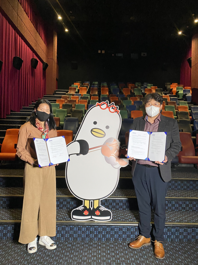 (주)샤콘느와 메가박스의 업무협약(MOU) 기념사진. 가운데는 부산시 캐릭터 '부기'다. (주)샤콘느 제공