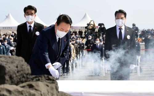 윤석열 대통령 당선인이 3일 제주 4·3평화공원에서 열린 제74주년 4·3희생자 추념식에서 분향하고 있다. 보수 정당 출신 대통령이나 당선인이 4·3 추념식에 참석하기는 이번이 처음이다. 연합뉴스