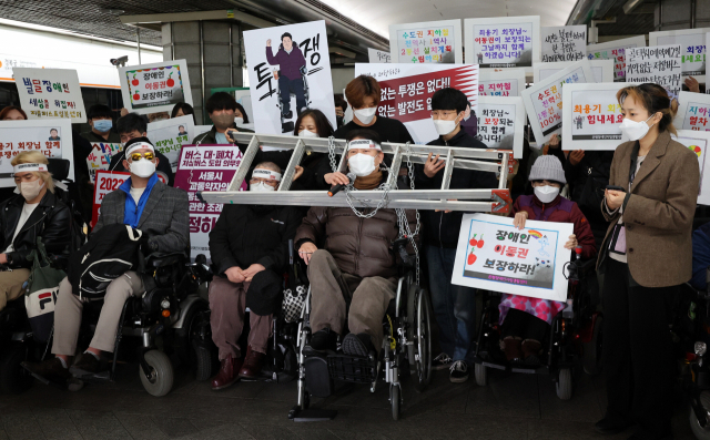 장애인 단체의 삭발 투쟁 결의식. 연합뉴스
