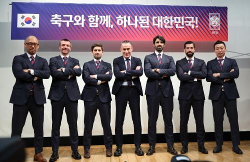 파울루 벤투 축구 국가대표팀 감독(왼쪽에서 네 번째)과 코치진이 7일 오후 파주 NFC(축구 국가대표팀 트레이닝센터)에서 2022 카타르 월드컵 본선 조편성과 관련한 기자회견을 마친 뒤 포즈를 취하고 있다. 연합뉴스
