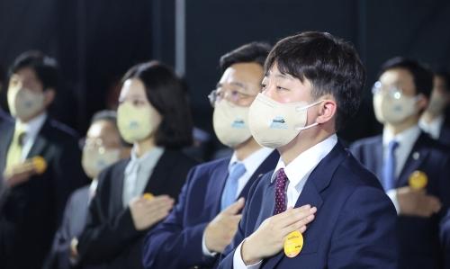 국민의힘 이준석(맨 앞) 대표, 더불어민주당 윤호중 비상대책위원장 등이 11일 제103주년 대한민국임시정부 수립 기념식에서 국기에 경례를 하고 있다. 연합뉴스