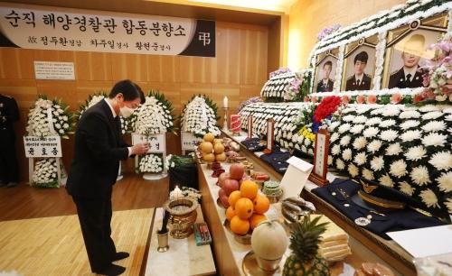 안철수 대통령직 인수위원장이 11일 오후 부산 부산진구 시민장례식장에 차려진 순직 남해해경청 항공대원 정두환 경감, 차주일·황현준 경사의 합동분향소를 찾아 조문하고 있다. 정종회 기자 jjh@제주도 마라도 남서 해상 헬기 추락사고로 순직한 해경에게 훈장이 추서됐다. 바다에 가라앉았던 헬기도 인양됐다. 해경은 헬기를 부산으로 옮겨 본격적인 사고 원인 분석에 나설 계획이다.