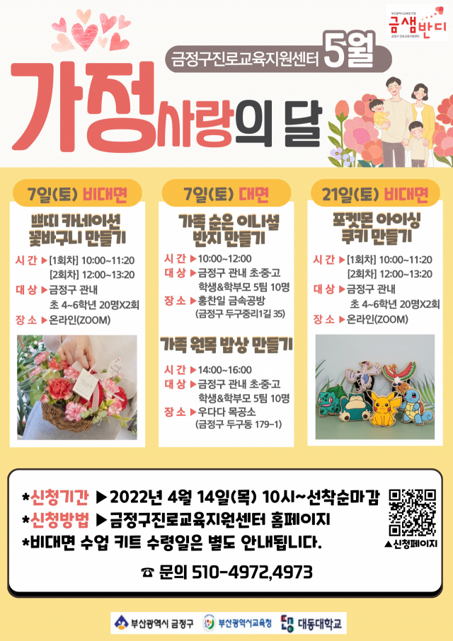 대동대학교(총장 배순철), 금정구진로교육지원센터(센터장 고재완)는 금정구 관내 청소년들의 진로역량을 강화하고 곧 다가올 가정의 달을 맞이하여 학생과 학부모들이 함께 하는 5월 프로그램을 운영한다.