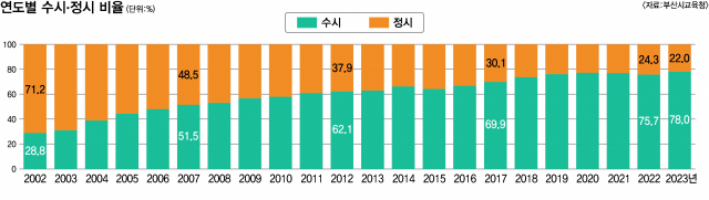 2023학년도 부산지역 4년제 15개 대학의 수시모집 비중은 올해보다 3.8%포인트 증가한 87.2%로, 부산대만 정시 인원을 146명 늘렸을 뿐 나머지 대학은 올해와 비슷하거나 줄였다.