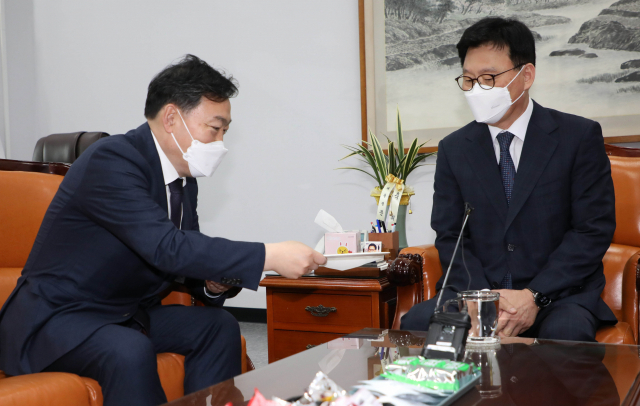 김오수 검찰총장이 14일 국회 법제사법위원회 위원장실에서 '검수완박' 반대입장을 전달하기 위해 박광온 법사위원장을 만나 서류를 전달하고 있다. 김 총장은 민주당이 이달 내 처리를 추진하고 있는 '검수완박'(검찰 수사권 완전 박탈) 법안에 대해 "헌법을 정면으로 위반하는 것"이라며 입법 절차를 진행할 국회를 먼저 방문했다. 연합뉴스