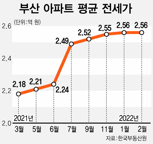 전세 가격의 상승은 매매가격 상승과 임대차 3법의 영향이 크다. 전월세상한제와 계약갱신청구권 도입으로 4년 동안 전세가를 5% 이상 상향 조정하는 데에 제한을 받는 집주인이 신규 계약 매물의 가격을 대폭 올리면서 전세가도 크게 올랐다. 지난해 6월 부산지역 아파트 평균 전세가는 2억 2431만 원이었다가 한 달 뒤 2억 4927만 원으로 급상승한 후 소폭 오름세를 유지해 올해 2월에는 2억 5656만 원을 기록했다.
