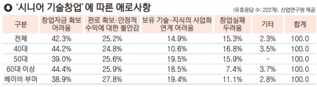 시니어 기술창업에 따른 가장 큰 애로사항은 '창업자금 확보 어려움'이라는 응답이 42.3%로 가장 높았고, 이어 ‘판로확보·안정적 수익에 대한 불안감’(25.2%), '창업 실패 두려움'(15.3%) 등의 순이었다.