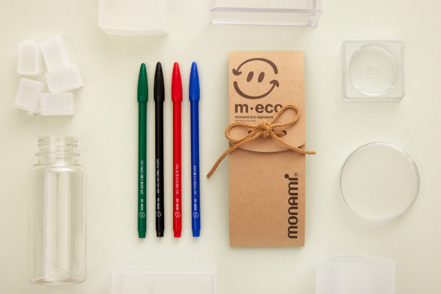 △모나미가 친환경 메시지를 담은 리사이클링 수성펜 '엠에코 프러스펜 3000'을 선보인다. 한 번 사용하고 버려지는 일회용 플라스틱을 원료로 만든 제품이다. 스테디셀러 '프러스펜 3000'의 펜 축을 재활용 플라스틱으로 만들었다. 기존 펜과 동일하게 0.4mm 두께로 세밀한 표현이 가능하며 블랙, 블루, 레드, 그린 등 총 4가지 컬러의 수성펜이 하나의 패키지에 담긴다. 컬러마다 '버려지는 것들의 의미 있는 변화', '무언가를 다시 만드는 시작', '다시, 또, 한 번 더 라는 가치', '지속 가능한 새롭고 올바른 실천'과 같은 서로 다른 친환경 감성 문구가 모나미 로고와 함께 각인돼 있어 필기할 때마다 건강한 지구를 지키고자 하는 마음을 되새길 수 있는 것이 특징이다. 포장 패키지 역시 친환경을 고려해 제작됐다. 코코아 껍질을 재활용한 종이로 제작한 패키지는 콩기름 잉크로 인쇄를 하고, 접착제 없이 오로지 종이로만 이뤄진 매듭끈을 사용했다. 온라인 쇼핑몰 모나미몰과 오프라인 모나미스토어, 주요 온오프라인 채널에서 구매할 수 있다.