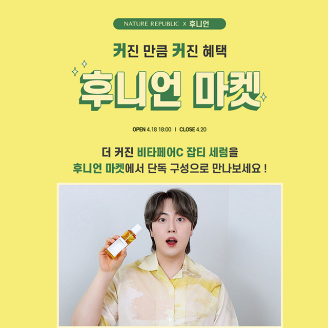 △네이처리퍼블릭은 18일 오후 6시, 인기 뷰티 유튜버 '후니언'과 함께 하는 소셜 마켓을 통해 '비타페어C 잡티 세럼' 대용량을 선공개한다. 카카오톡 플러스 친구에서 '후니언마켓'을 추가하면 마켓 시작 10분 전에 구매 링크를 미리 받아볼 수 있다. 비타페어C 잡티 세럼 대용량 특별 할인은 물론 토너 등 세트 구입 시 선착순 300명에게 동일 라인의 마스크시트 정품 10매를 선물로 증정한다. 비타페어C 잡티 세럼은 제주 그린 레몬 추출물 79.9%와 시카 성분을 함유한 미백 기능성 잡티 케어 제품으로 칙칙해진 피부를 환하고 매끄럽게 가꿔주며 탄탄한 피부결까지 한 번에 케어할 수 있다. 잡티개선뿐 아니라 피부결, 수분도, 안색까지 단계별로 케어해 피부 균형을 되찾는데 도움을 준다. 9가지 인체적용 테스트(색소침착, 멜라닌, 깊은멜라닌, 밝기, 균일도, 피부결, 윤기, 수분개선, 피부 1차 자극 테스트)를 완료해 안심하고 사용할 수 있다. 21일부터 네이처리퍼블릭 전국 매장과 공식 온라인몰을 통해 만나볼 수 있다.