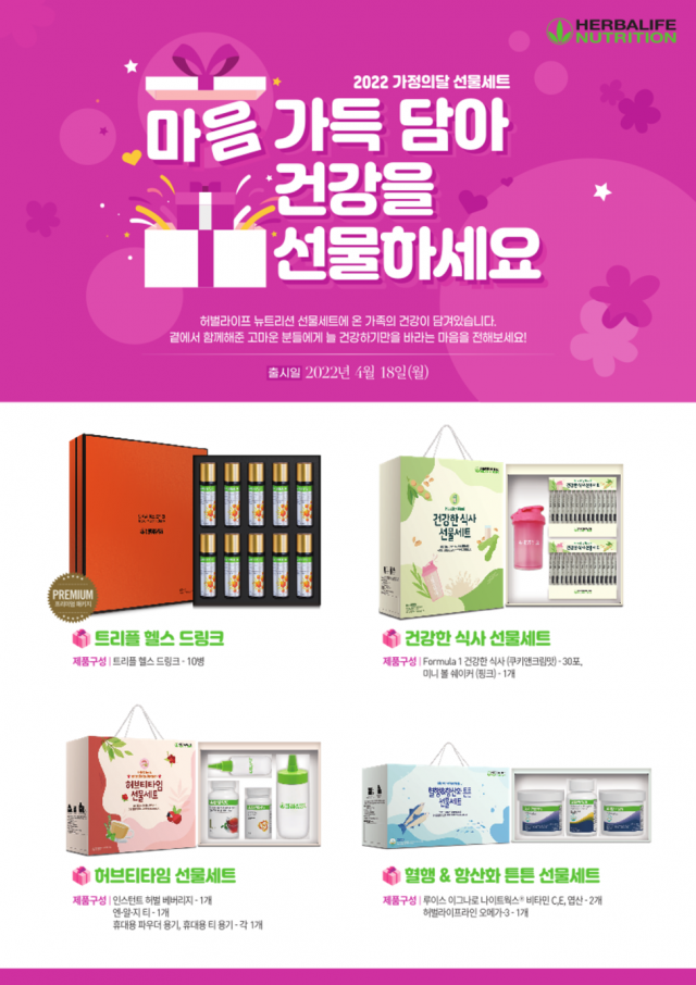 △한국허벌라이프가 '2022 가정의 달 선물세트'를 풍성하게 마련했다. 바쁜 일상에 지친 현대인에게 활기를 전하는 '트리플 헬스 드링크' 세트는 건강에 좋은 프로폴리스, 로얄젤리, 아가리쿠스의 세 가지 원료를 주성분으로 배합해 만든 건강음료 '트리플 헬스 드링크' 10병을 포함했다. 일상에서 여유와 휴식을 찾을 수 있도록 '허브티타임 선물세트'도 준비했다. 체내 수분 보충을 돕는 '인스턴트 허벌 베버리지' 1개와 '엔-알-지 티' 1개, 그리고 전용 휴대용 용기 2종이 포함돼 있다. 식사를 제시간에 챙기기 힘든 학생·직장인을 위한 '건강한 식사' 선물세트에는 'Formula 1 건강한 식사' 쿠키앤크림맛 30포와 미니 볼 쉐이커가 포함돼 있다. Formula 1 건강한 식사는 허벌라이프 뉴트리션의 스테디셀러로 단백질을 비롯해 17가지 비타민과 무기질, 그리고 허브와 식이섬유를 균형 있게 공급해 식사대용식으로 안성맞춤이다. 나이가 들면서 노화가 걱정인 부모님 세대를 위해서는 '혈행 & 항산화 튼튼 선물세트'를 추천한다. '루이스 이그나로 나이트웍스® 비타민 C, E, 엽산'은 유해산소로부터 인체를 보호해주는 항산화 영양소인 비타민 C와 E를 공급해주고 세포, 혈액 생성에 필요한 영양소인 엽산이 함유됐다. '허벌라이프라인 오메가-3'는 혈중 중성지질 개선에 도움을 줄 수 있는 DHA와 EPA의 합으로 하루 507mg의 오메가-3 지방산과 더불어 비타민E를 공급해 항산화 효과와 혈행건강 개선에 도움을 줄 수 있다. 한국허벌라이프 독립 멤버 또는 공식 웹페이지를 통해 구매할 수 있다.