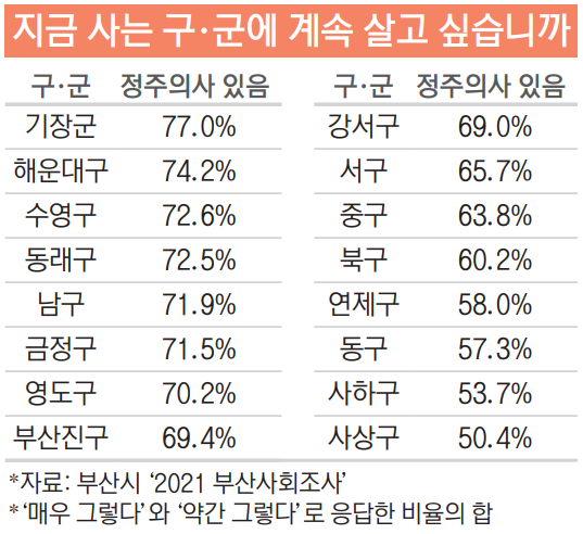 반면 동부산권으로 분류되는 지역 주민들은 정주 의사가 크게 높았다. 기장군과 해운대구, 수영구, 남구 주민들 정주 의사가 있다고 응답한 비율은 각각 77.0%, 74.2%, 72.6%, 71.9%다. 16개 구군 가운데 1, 2, 3, 5위에 해당하는 수치다. 이들의 주거 만족도 또한 대체로 높았다.
