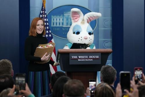부활절 토끼 인형인 ‘이스터 버니’가 18일(현지시간) 젠 사키 미국 백악관 대변인을 대신해 일일 브리핑에 나섰다. 백악관은 코로나19로 중단했던 부활절 달걀 굴리기 행사를 3년 만인 올해 재개했다. AP연합뉴스