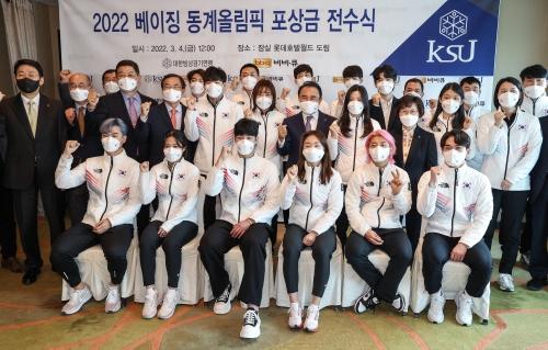 2022 베이징 동계올림픽 포상금 전수식에 참여한 메달리스트들. 연합뉴스2022 베이징 동계올림픽에서 메달리스트 모두 ‘치킨 연금’을 받는다.