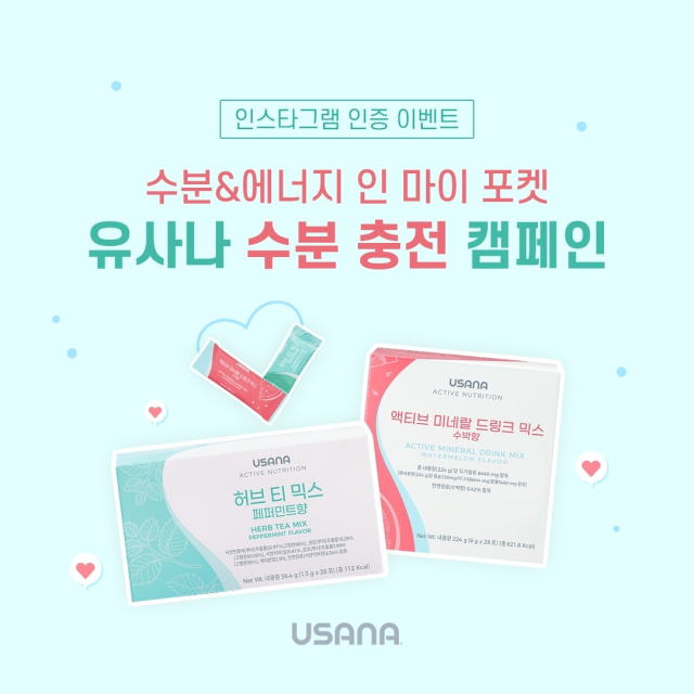△유사나헬스사이언스코리아는 다가오는 여름철을 대비해 수분 섭취의 중요성을 알리고 건강한 수분 섭취 습관 형성을 도와줄 '유사나 수분 섭취 건강 캠페인'을 진행한다. 오는 24일까지 유사나 공식 인스타그램에서 진행되며, '허브 티 믹스'와 '액티브 미네랄 드링크 믹스' 2가지 제품을 마시는 모습을 인증해 일상 속에서도 쉽게 수분 건강을 챙길 수 있도록 독려한다. 참여 방법은 간단하다. 먼저 유사나 공식 인스타그램 팔로우와 캠페인 관련 게시글에 '좋아요'를 누른 후 캠페인 설명에 따라 개인 인스타그램에 수분섭취 인증샷과 함께 필수 해시태그를 함께 업로드하면 참여 완료된다. 허브 티 믹스·액티브 미네랄 드링크 믹스 포를 하트 모양으로 만들어 인증하는 것이 핵심이다. 캠페인 참여자 중 총 40명을 선정, 편리하게 휴대 가능한 '유사나 보틀'과 함께 허브 티 믹스 또는 액티브 미네랄 드링크 믹스 제품을 함께 증정해 캠페인 종료 후에도 지속적으로 수분 건강을 챙길 수 있도록 응원한다.