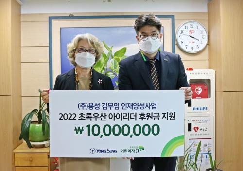 (주)용성(회장 김무임·왼쪽)은 15일 초록우산어린이재단(부산지역본부장 노희헌·오른쪽)에 아동인재양성 지원사업 ‘아이리더’ 후원금 1000만 원을 전달했다.