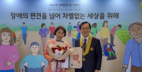 강충걸((주)파나컴 대표·오른쪽) (사)부산국제장애인협의회 회장은 20일 서울 여의도에서 열린 ‘제42회 장애인의 날 기념식’에서 국민훈장 ‘모란장’을 수훈했다.