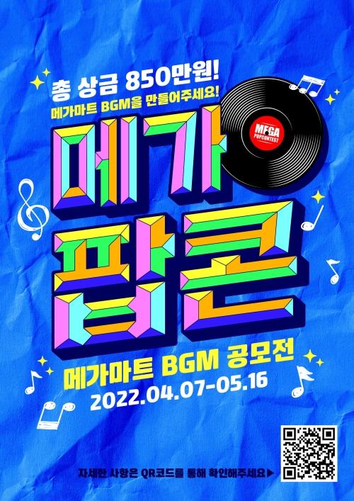 메가마트가 내달 16일까지 메가마트 브랜드송 공모전 ‘메가 팝콘(사진)'을 진행한다. 브랜드송의 주제는 쇼핑과 힐링, 신선한 상품, 사랑하는 가족과 맛있는 식사 등이다. 브랜드송에는 매장 분위기를 활기차게 할 수 있는 가사와 듣는 사람이 즐거워지는 멜로디가 담겨야 한다. 가사와 배경 음악이 어우러진 4분 이내 창작곡이어야 하며 장르는 무관하다.