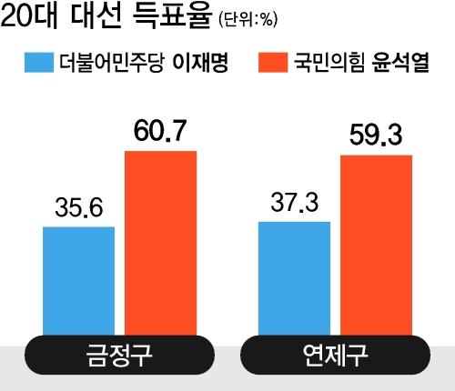 부산 금정은 3·9 대선과 지난해 4·7 재·보궐선거에서 강한 보수세가 확인된 곳이다. 대선 당시 국민의힘 윤석열 후보 득표율이 60.7%로 부산 16개 구·군 중 해운대(60.9%), 수영(60.8%)에 이어 3번째로 높았다. 지난해 부산시장 보궐선거에서는 국민의힘 박형준 후보 득표율이 65.4%로 부산 구·군 중 1위였다.