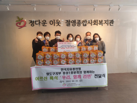 한국자유총연맹 동삼1동분회(회장 김옥희)는 지난 4월 22일 코로나19로 인해 무료 급식이 중단되어 어려움을 겪고 있는 노인들을 위한 성품을 절영종합사회복지관(관장 서미라)에 전달하였다.