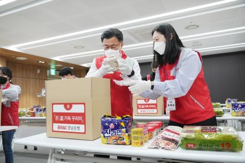 BNK경남은행 최홍영 은행장과 입행 1년차 신입행원들이 본점 회의실에서 즉석 밥·죽·찌개 등 간편 조리식으로 구성된 온(溫)가득 꾸러미를 만들고 있다. 경남은행 제공겨울바람은 그늘진 곳에 더 차갑게 분다. 길어진 코로나19로 개인 기부와 기업 후원이 감소하고 대면 접촉 제한으로 봉사활동도 줄어들면서 도움이 필요한 이웃들은 더 추운 겨울을 지냈다.