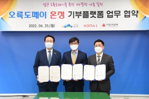 부산 남구청(구청장 박재범), 코나아이(주)(대표이사 조정일), 부산사랑의열매(회장 최금식)는 25일 남구청에서 ‘오륙도페이 온정’ 업무 협약식을 했다. 협약식에는 박재범(왼쪽) 남구청장, 변동훈(가운데) 코나아이(주) 부사장, 박은덕(오른쪽) 부산사랑의열매 사무처장이 참석했다.