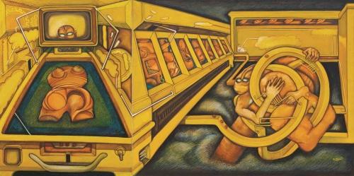 묘한 감수성을 자극하는 노란 색감이 시선을 사로잡는다. 캔버스를 가득 채우고 있는 기계는 시공간을 유추할 수 없는 제3의 공간으로 보인다. 화면을 가득 채우고 있는 기계에서 시선을 돌리면 인간의 형태를 띠고 있으나, 성별이나 나이를 짐작할 수 없는 사람들이 기계와 한 몸이 되어있음을 발견하게 된다. 인간의 기계화라는 디스토피아를 그로테스크하면서도 일러스트적 감수성으로 표현하고 있는 이 작품은 전자오락실을 배경으로 한다. 기계 속에 편입되어 마치 게임 속 말이 된 듯한 인간들은 경쟁 속에서 기계적으로 소모되고 있는 시대의 인물상을 은유적으로 표상하는 듯하다.