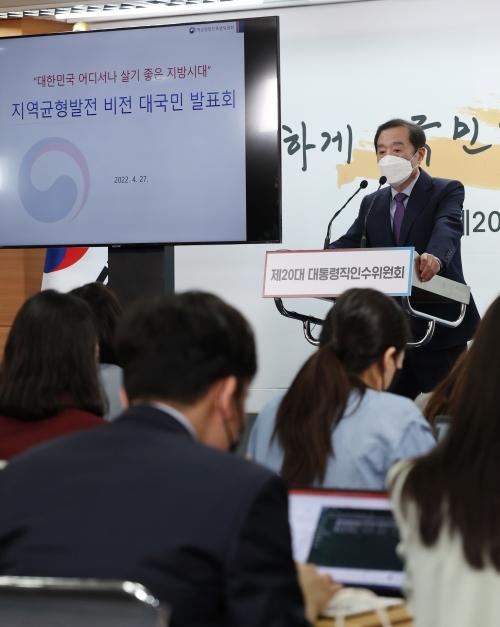 김 위원장은 이날 서울 종로구 통의동 인수위에서 지역균형발전 국정과제 발표 기자회견을 열고 “윤석열 정부는 지역 불균형 문제를 더 이상 방치할 수 없다는 인식을 분명히 하고 지역균형 발전 전략의 패러다임을 대전환할 것”이라고 밝혔다.