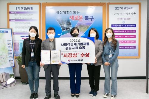 부산 북구청은 27일 부산시청에서 개최된 ‘2022년 사회적경제 부산네트워크 정기총회’에서 지난해 사회적경제기업제품 공공구매 확대와 적극적인 판로 지원으로 사회적경제 활성화에 기여한 공을 인정받아 ‘시장상’을 받았다.