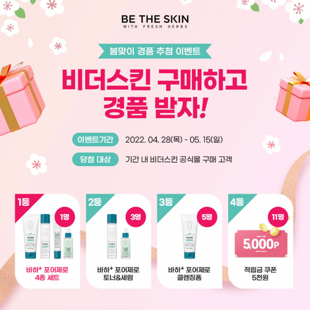 △저자극 클린 뷰티 브랜드 비더스킨이 28일부터 5월 15일까지 비더스킨 공식몰에서 구매한 고객 대상으로 추첨을 통해 푸짐한 경품을 증정하는 봄맞이 행사를 진행한다. 행사기간 동안 비더스킨 공식몰에서 제품을 구매한 고객은 자동으로 응모된다. 구매 금액과는 무관하게 추첨을 통해 총 20명의 고객을 선정해 1등 바하플러스 4종세트(7만 원 상당), 2등 바하플러스 2종(3만 7000원 상당), 3등 비더스킨 본품 1종, 4등 적립금(5000원)을 증정한다. 행사 당첨자 발표는 5월 18일 비더스킨 공식몰에서 발표될 예정이며, 공식 SNS채널에도 추가 안내가 될 예정이다.
