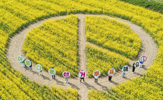 제8회 전국동시지방선거를 50여 일 앞둔 6일 부산 강서구 대저생태공원 유채꽃밭에 조성된 기표 모양 꽃길에서 부산시 선관위 직원들이 투표 참여를 홍보하고 있다. 김종진 기자 kjj1761@