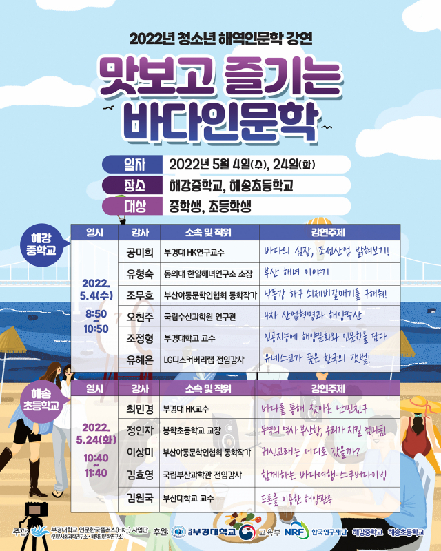 국립부경대학교(총장 장영수)가 오는 5월 4일과 24일 지역 초‧중등학교를 직접 찾아 '2022년 청소년 해역인문학 강연-맛보고 즐기는 바다인문학' 프로그램을 연다.