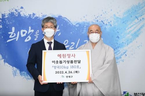 부산 연제구 연산동 혜원정사(주지 원허 스님)는 지난달 26일 저소득층 180세대를 위해 백미 10㎏들이 180포를 연제구청에 전달했다.